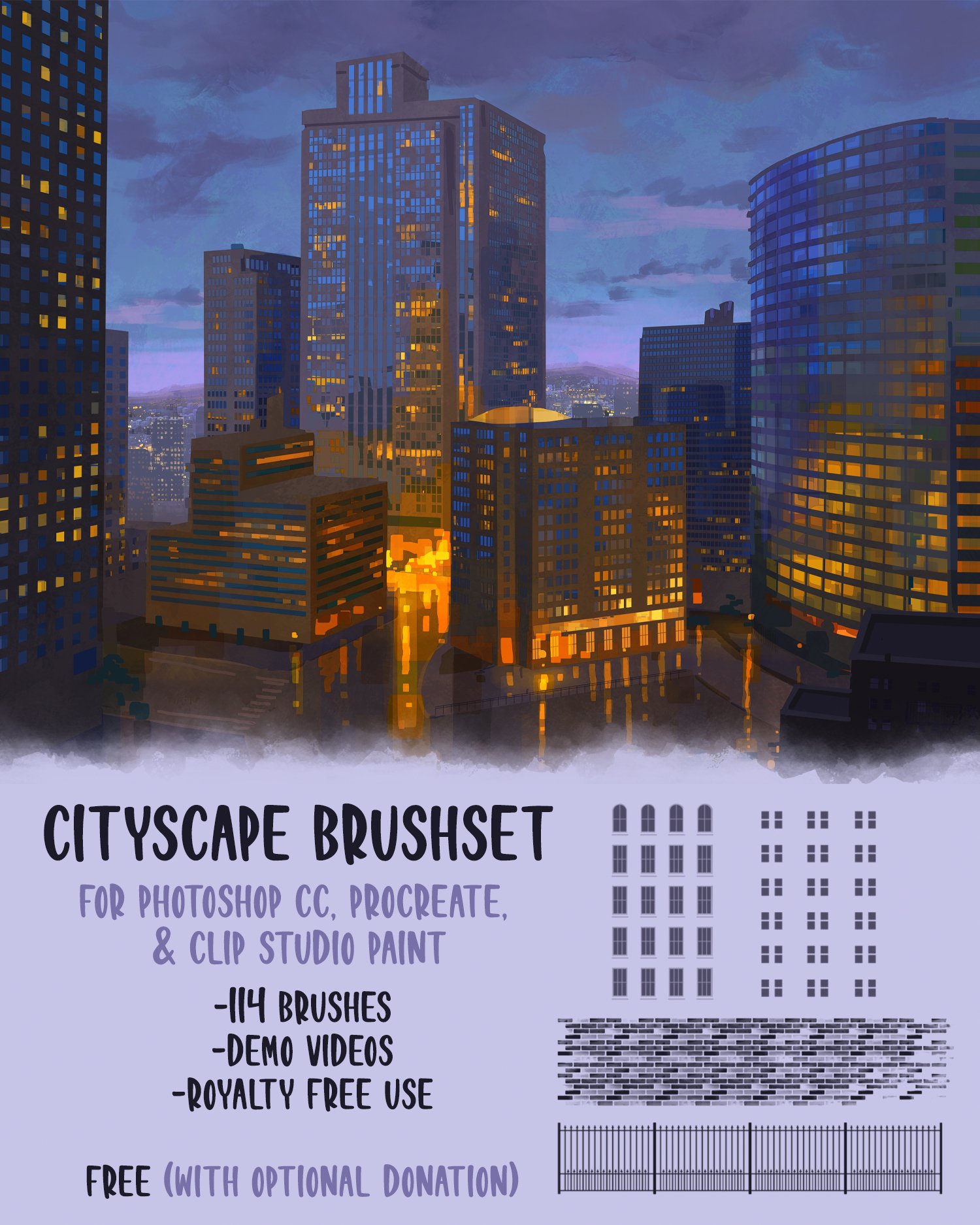 This is a set of 114 responsive cityscape-themed brushes for Photoshop CC, Procreate, and Clip Studio Paint. This set is free but tips are gladly welcomed and help me make more resources! -114 brushes -Over an hour of demo video content -PNGs included for other programs -Use royalty-free in any personal or commercial work -Tags/shout-outs appreciated but not required I created these brushes to speed up my own process of painting cities. I hope you all enjoy them! | 1,400 | AssetsDemo Video | ImageVideo | Design | $5.00 | Gumroad | |||
